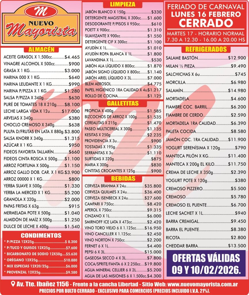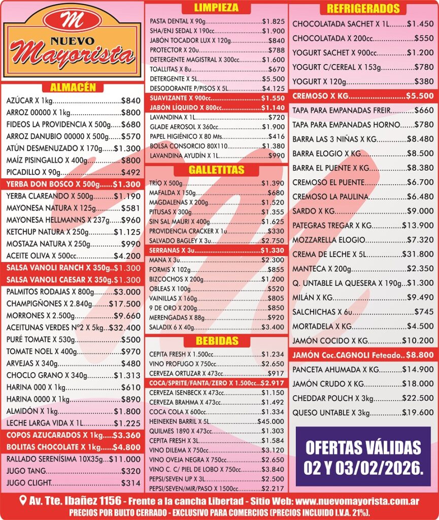 TODAS LAS CATEGORÍASAhorra hasta un 40% en tus compras Limpieza Lacteos Golosinas Bebidas Fríos Varios PRODUCTOS DESTACADOS Las imágenes son meramente ilustrativas Válido hasta el 02 y 03 de Febrero Cepita Fresh x1500cc – $1234.00 $ 1.234,00 image/svg+xml Add to cart Cerveza Isenbeck x473cc – $1150.00 $ 1.150,00 image/svg+xml Add to cart Gall. Providencia Crackers x101g – $330.00 $ 330,00 image/svg+xml Add to cart Jabón Liq. Signo x800cc – $1140.00 $ 1.140,00 image/svg+xml Add to cart Jabón Toc. Lux x120g – $840.00 $ 840,00 image/svg+xml Add to cart Jugo Clight – $314.00 $ 314,00 image/svg+xml Add to cart Mayonesa Natura x125g – $581.00 $ 581,00 image/svg+xml Add to cart Queso Cremoso El Puente – $6700.00 kg $ 6.700,00 image/svg+xml Add to cart Por favor, activa JavaScript en tu navegador para completar este formulario.Por favor, activa JavaScript en tu navegador para completar este formulario.Nombre *NombreApellidosTelefono Celular (WhatsApp)Correo electrónico *Comentario o mensajeEnviar