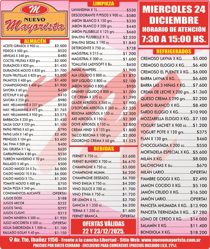TODAS LAS CATEGORÍASAhorra hasta un 40% en tus compras Limpieza Lacteos Golosinas Bebidas Fríos Varios PRODUCTOS DESTACADOS Las imágenes son meramente ilustrativas Válido hasta el 22 y 23 de diciembre Champagne Mumm x750cc – $6200.00 $ 6.200,00 image/svg+xml Add to cart Detergente Magistral x300cc – $1600.00 $ 1.600,00 image/svg+xml Add to cart Duraznos Molto x820g – $1700.00 $ 1.700,00 image/svg+xml Add to cart Jabón Líquido Ala x800cc – $1870.00 $ 1.870,00 image/svg+xml Add to cart Mayonesa Hellmann`s x237g – $950.00 $ 950,00 image/svg+xml Add to cart Queso Cremoso Elogio – $6400.00 Kg $ 6.400,00 image/svg+xml Add to cart Salsa Golf Dánica x220g – $1100.00 $ 1.100,00 image/svg+xml Add to cart Yogur Cremigal Sachet x900cc – $1200.00 $ 1.200,00 image/svg+xml Add to cart Por favor, activa JavaScript en tu navegador para completar este formulario.Por favor, activa JavaScript en tu navegador para completar este formulario.Nombre *NombreApellidosTelefono Celular (WhatsApp)Correo electrónico *Comentario o mensajeEnviar
