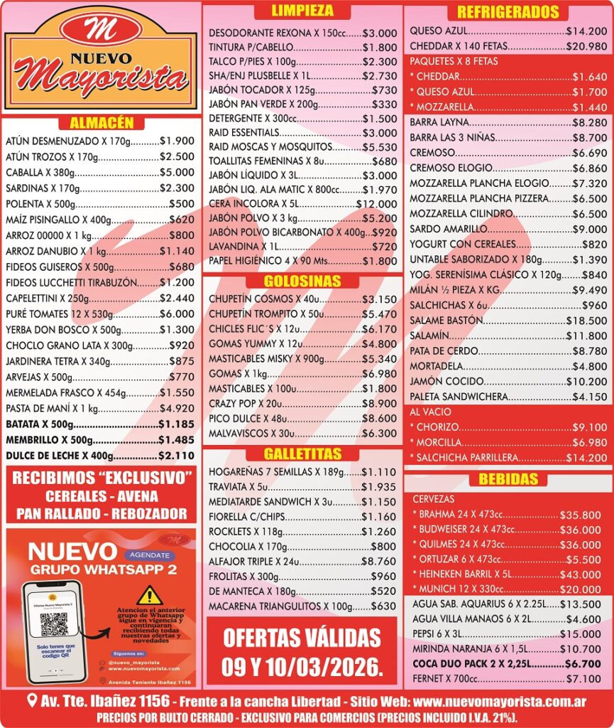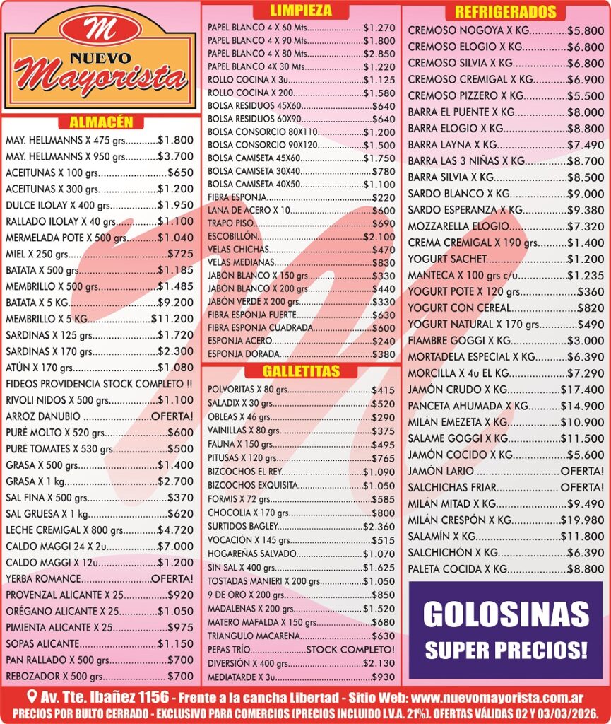 TODAS LAS CATEGORÍASAhorra hasta un 40% en tus compras Limpieza Lacteos Golosinas Bebidas Fríos Varios PRODUCTOS DESTACADOS Las imágenes son meramente ilustrativas Válido hasta el 02 y 03 de marzo Atún El Dique Desmenuzado x170g – $1080.00 $ 1.080,00 image/svg+xml Add to cart Dulce de Leche Ilolay x400g – $1950.00 $ 1.950,00 image/svg+xml Add to cart Galletita Surtido Diversion x400g – $2130.00 $ 2.130,00 image/svg+xml Add to cart Jabón Signo x200g – $440.00 $ 440,00 image/svg+xml Add to cart Mayonesa Hellamann`s x475g – $1800.00 $ 1.800,00 image/svg+xml Add to cart Queso en Barra El Puente – $8000.00 kg $ 8.000,00 image/svg+xml Add to cart Rollo de Cocina Cartabella x3u – $1125.00 $ 1.125,00 image/svg+xml Add to cart Yogur con Cereal Cremigal x140g – $820.00 $ 820,00 image/svg+xml Add to cart Por favor, activa JavaScript en tu navegador para completar este formulario.Por favor, activa JavaScript en tu navegador para completar este formulario.Nombre *NombreApellidosTelefono Celular (WhatsApp)Correo electrónico *Comentario o mensajeEnviar