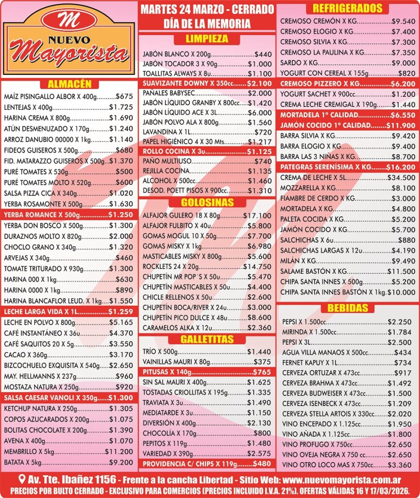 TODAS LAS CATEGORÍASAhorra hasta un 40% en tus compras Limpieza Lacteos Golosinas Bebidas Fríos Varios PRODUCTOS DESTACADOS Las imágenes son meramente ilustrativas Válido hasta el 16 y 17 de marzo Alfajor Gulero x80g – $950.00 $ 950,00 image/svg+xml Add to cart Bizcochuelo Exquisita x540g – $2650.00 (todos excepto chocolate) $ 2.650,00 image/svg+xml Add to cart Gall. Providencia Chips Chocolate x119g – $480.00 $ 480,00 image/svg+xml Add to cart Suavizante Downy x350cc – $2100.00 $ 2.100,00 image/svg+xml Add to cart Toallitas Always x8u – $1100.00 $ 1.100,00 image/svg+xml Add to cart Tostadas Criollitas x195g – $1335.00 $ 1.335,00 image/svg+xml Add to cart Yerba Romance x500g – $1250.00 $ 1.250,00 image/svg+xml Add to cart Yogur Cremigal Sachet x900cc – $1200.00 $ 1.200,00 image/svg+xml Add to cart Por favor, activa JavaScript en tu navegador para completar este formulario.Por favor, activa JavaScript en tu navegador para completar este formulario.Nombre *NombreApellidosTelefono Celular (WhatsApp)Correo electrónico *Comentario o mensajeEnviar