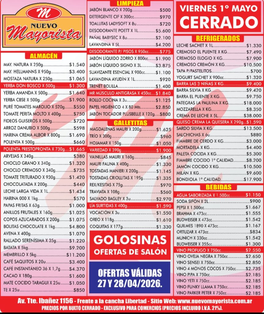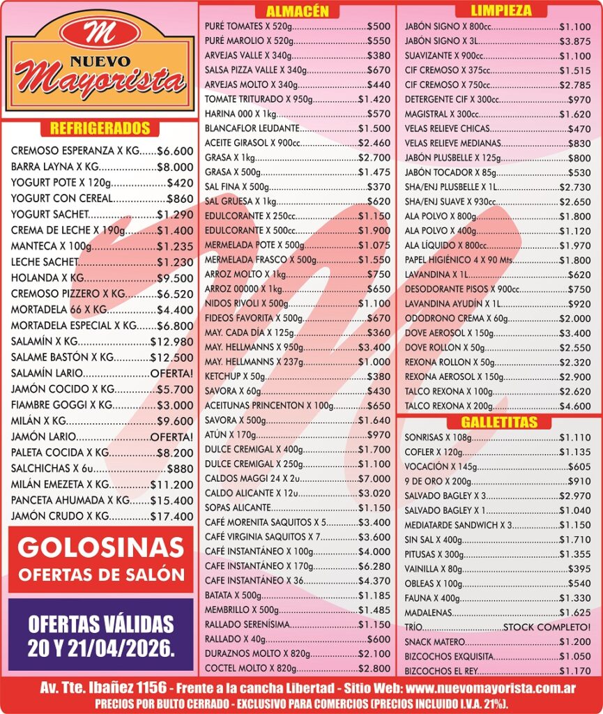TODAS LAS CATEGORÍASAhorra hasta un 40% en tus compras Limpieza Lacteos Golosinas Bebidas Fríos Varios PRODUCTOS DESTACADOS Las imágenes son meramente ilustrativas Válido hasta el 20 y 21 de abril ATUN EL DIQUE DESMENUZADO X170G – $970.00 $ 970,00 image/svg+xml Add to cart CAFE LA MORENITA SAQ. 20X5G – $3400.00 $ 3.400,00 image/svg+xml Add to cart DESOD REXONA AEROSOL WOMEN/MEN X150ML $2900.00 $ 2.900,00 image/svg+xml Add to cart DULCE DE LECHE CREMIGAL X400G – $1700.00 $ 1.700,00 image/svg+xml Add to cart HARINA BLANCAFLOR LEUD. X1KG – $1500.00 $ 1.500,00 image/svg+xml Add to cart LAVANDINA AYUDIN X1L – $920.00 $ 920,00 image/svg+xml Add to cart PURE TOM. MAROLIO X520G – $550.00 $ 550,00 image/svg+xml Add to cart QUESO RALLADO SERENISIMA X35G – $1150.00 $ 1.150,00 image/svg+xml Add to cart Por favor, activa JavaScript en tu navegador para completar este formulario.Por favor, activa JavaScript en tu navegador para completar este formulario.Nombre *NombreApellidosTelefono Celular (WhatsApp)Correo electrónico *Comentario o mensajeEnviar