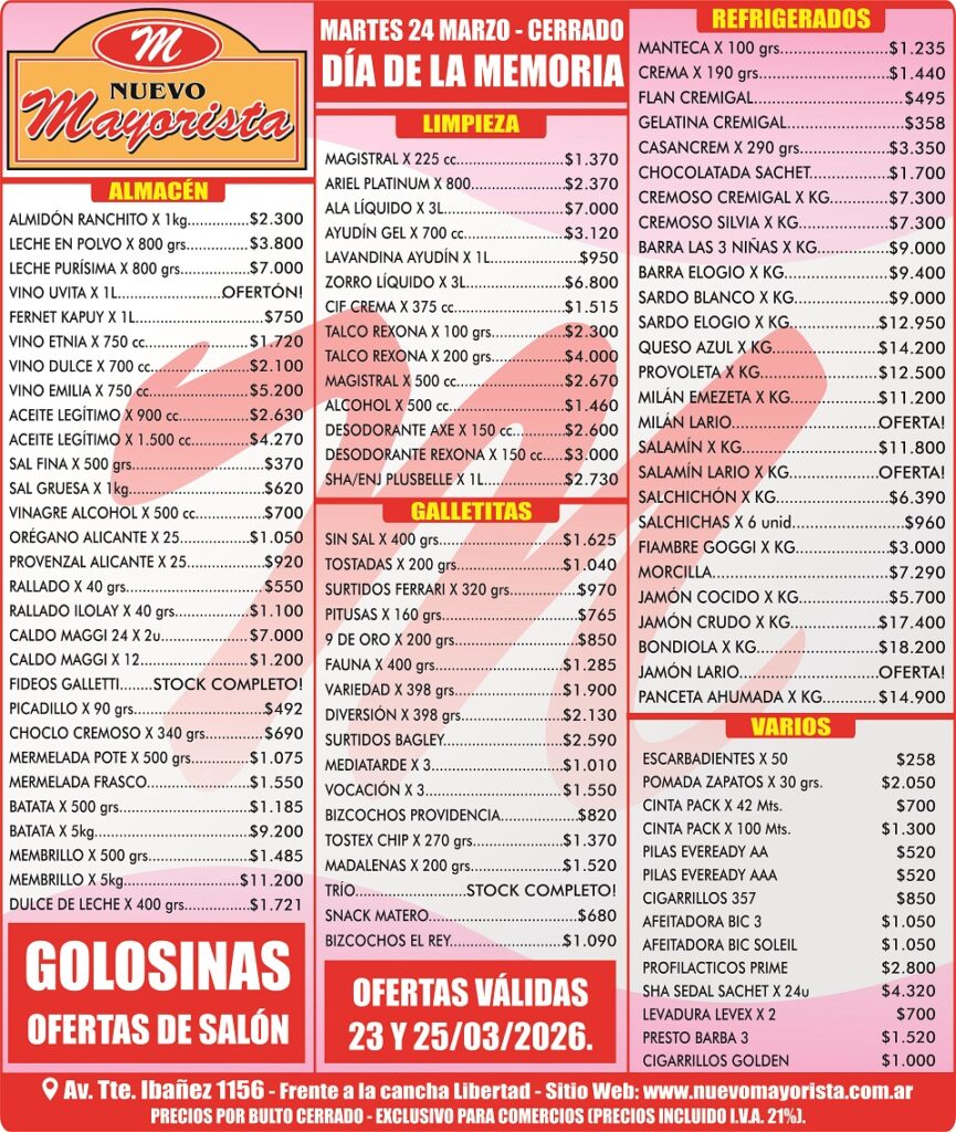 TODAS LAS CATEGORÍASAhorra hasta un 40% en tus compras Limpieza Lacteos Golosinas Bebidas Fríos Varios PRODUCTOS DESTACADOS Las imágenes son meramente ilustrativas Válido hasta el 23 y 25 de marzo ACEITE LEGÍTIMO X900CC – $2630.00 $ 2.630,00 image/svg+xml Add to cart GALLETITAS VARIEDAD X398G – $1900.00 $ 1.900,00 image/svg+xml Add to cart JABÓN LIQ. ARIEL PLATINUM X800CC – $2370.00 $ 2.370,00 image/svg+xml Add to cart LAVANDINA GEL AYUDIN X700CC – $3120.00 $ 3.120,00 image/svg+xml Add to cart LECHE EN POLVO SANTA ELENA X800G – $3800.00 $ 3.800,00 image/svg+xml Add to cart MAGISTRAL X500CC – $2670.00 $ 2.670,00 image/svg+xml Add to cart QUESO RALLADO ILOLAY X40G – $1100.00 $ 1.100,00 image/svg+xml Add to cart SHAMPOO SEDAL SACHET X24U – $4320.00 $ 4.320,00 image/svg+xml Add to cart Por favor, activa JavaScript en tu navegador para completar este formulario.Por favor, activa JavaScript en tu navegador para completar este formulario.Nombre *NombreApellidosTelefono Celular (WhatsApp)Correo electrónico *Comentario o mensajeEnviar